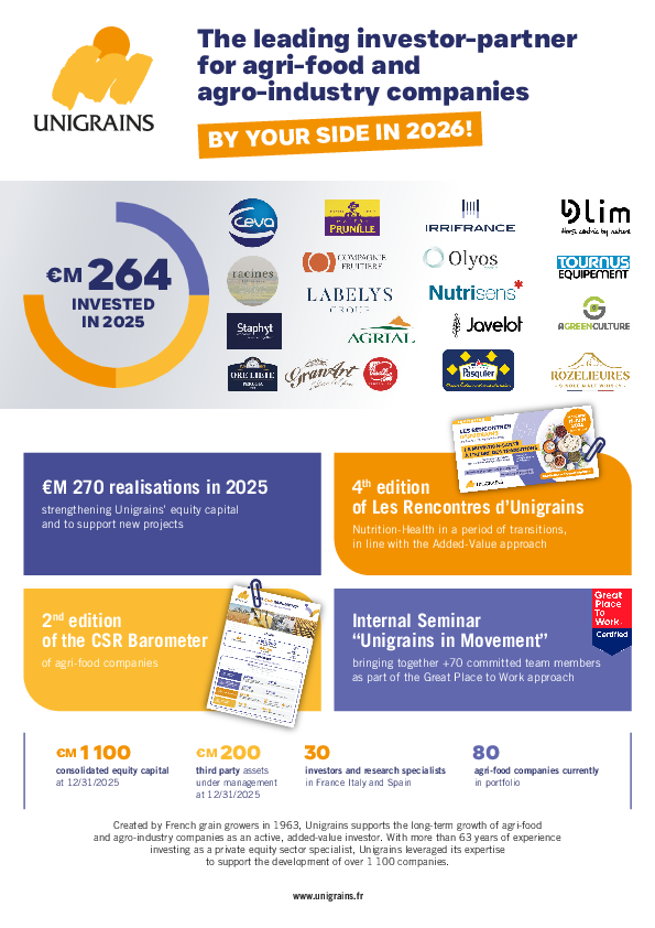 Unigrains Italia interviene in qualità di investitore settoriale, responsabile e di lungo termine nel capitale di piccole e medie imprese italiane dell’agroalimentare valutate tra 30 e 150 mln € con singoli ticket di investimento compresi tra 5 e 25 mln € come quota di partecipazione finale. La sua ambizione è di investire da 80 a 100 mln €, direttamente e tramite azioni, in una decina di aziende di tutta la catena del valore agroalimentare, al fine di accompagnare i loro progetti di sviluppo attraverso la crescita esterna/organica, l’internazionalizzazione o le transizioni azionarie, sempre a stretto contatto con i loro dirigenti.